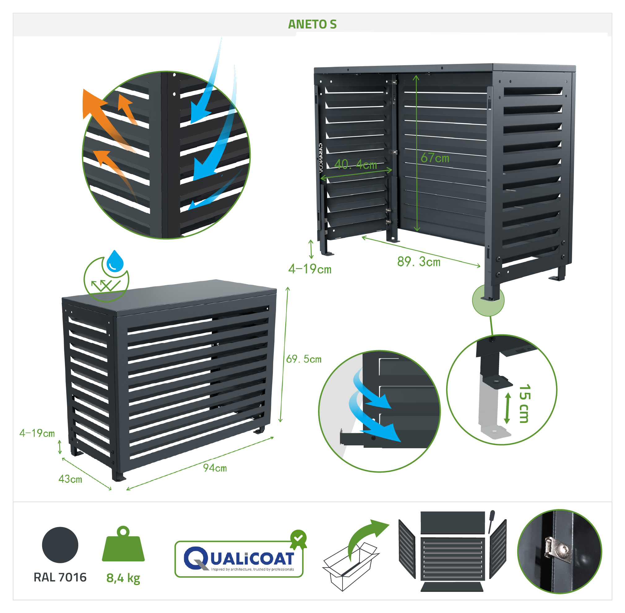 De Aneto aluminium airconditionerhoes maakt indruk met zijn lamellenontwerp en biedt een discrete en elegante uitstraling. De aluminium constructie zorgt voor een verfijnde afwerking, opmerkelijk lichtheid en uitstekende weerbestendigheid, ideaal voor langdurig gebruik buitenshuis. Een geïntegreerde verstevigingsbalk aan de bovenzijde versterkt de structuur, wat zorgt voor meer stijfheid, optimale duurzaamheid en verhoogde weerstand tegen invloeden van buitenaf.